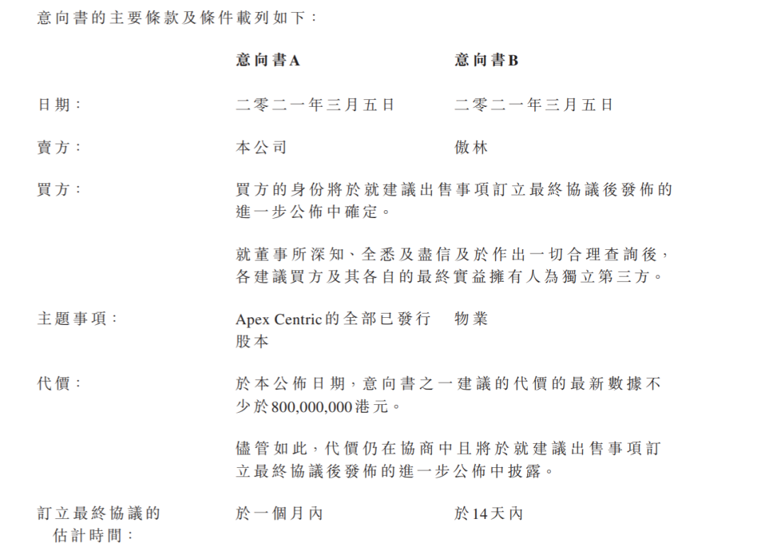 针对此次出售事宜,香港卓悦拟定了两种方案,一是通过傲林有限公司(下称:傲林)向买方直接转让物业,二是透过向买方出售旗下子公司ApexCentric或傲林的全部已发行股本的方式完成,建议代价不少于6.7亿元。