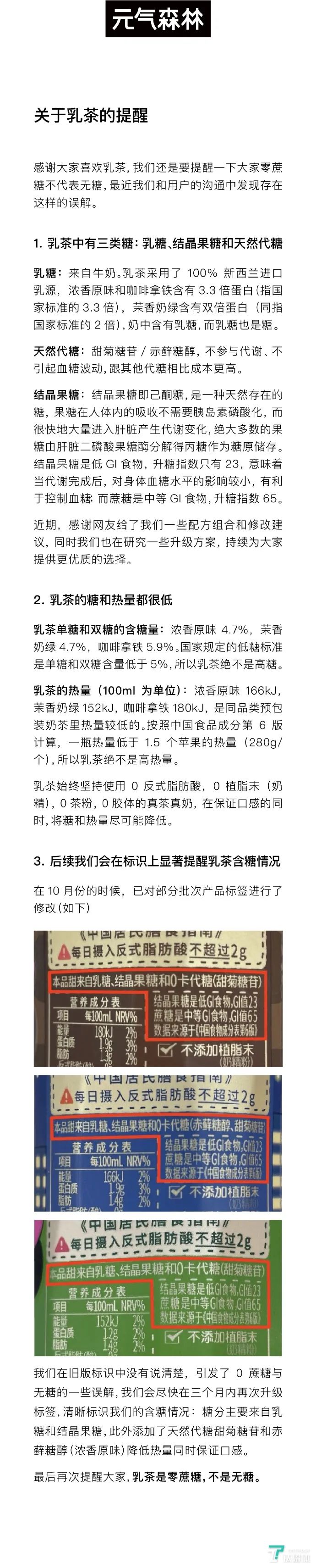 今年1月,有网友对于“元气森林乳茶产品”在社交平台发起其含有乳糖和结晶果糖的讨论。有营养学家指出,0蔗糖不代表0糖。彼时,元气森林发布《关于乳茶的提醒》,表示已经注意到这一问题并已经对部分乳茶产品标签进行了修改,承诺将在三个月内完成对乳茶全部产品标签的修改。