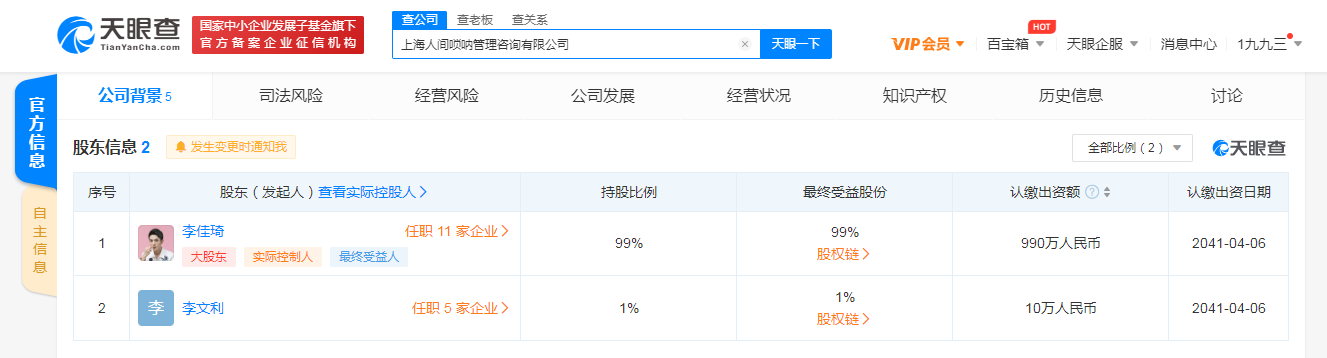 美腕合伙人李佳琦也成立了新公司。天眼查App显示,5月8日,上海人间唢呐管理咨询有限公司、上海琦才管理咨询有限公司接连成立,法定代表人同为李文利,注册资本均为1000万人民币,经营范围均包括广告发布;电子商务;化妆品的销售;货物进出口等。股东信息显示,两公司的最大股东均为李佳琦,持股比例99%,为最终受益人及疑似实际控制人。