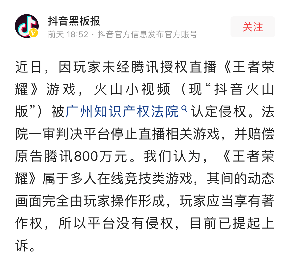 5月10日,抖音通过官方头条号“抖音黑板报”对抖音火山版被判侵权一事做出回应。此前,因一抖音火山版用户未经腾讯授权直播游戏《王者荣耀》,广州知识产权法院判定抖音火山版侵权,需赔偿原告腾讯800万元。抖音回应称,《王者荣耀》的动态画面由玩家操作形成,玩家应当享有著作权,所以平台没有侵权,并表示已经提起上诉。