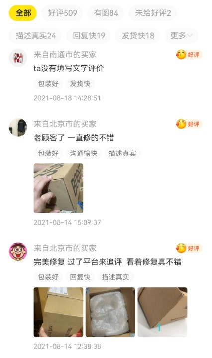 现如今,不少人捕捉到了鞋盒修复这一商机,淘宝、闲鱼等平台涌现了一些修鞋盒的店铺和个人。伴随商机出现的是各种各样的问题,这些问题中最麻烦的,就是售后。