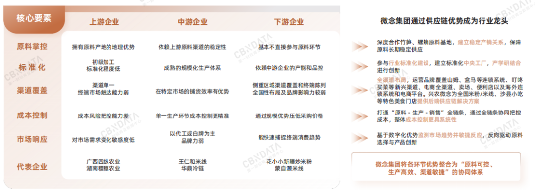 这背后是米粉企业的核心竞争力从单一环节的绝对性优势转向在完整产业链上的供应链优势整合。从这一维度上来看,在线上线下市占率第一的优势之外,微念集团还通过“原料-生产-销售”一体化运营,有效整合了产业链资源,达成成本优化与效率协同,在米粉产业全链条上确立了其行业龙头的地位。