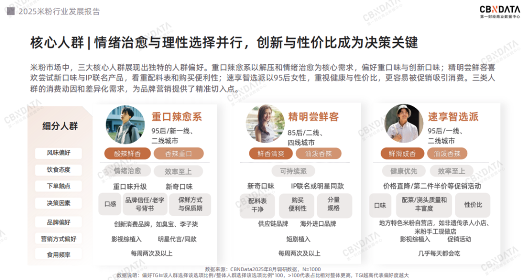 基于口味与功能价值两大维度,米粉消费市场可被细分为五大核心群体,其中三大主力人群尤为关键:“重口辣愈系”以95后为代表,TA们偏好酸辣、重口风味,追求极致口感带来的情绪释放。食用频率高,每周≥2次,常选择创新消费品牌或明星同款;“精明尝鲜客”以85后为主,TA们注重品质和分量,乐于尝试IP联名等新奇产品,但决策时会仔细研究配料表,兼具理智与好奇;“速享智选派”则主要是一二线城市的年轻上班族,TA们强调效率与健康兼顾,对促销活动敏感,几乎每天都有食用习惯,是典型的高频刚需群体。