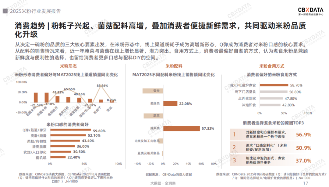 供给侧的核心竞争力进阶也驱动了产品的创新升级,报告进一步洞察了过去一年米粉消费的新趋势。例如,在米粉的形态与配料上,新形态粉耗子、配料腌菜菌菇是近一年销量高增的新趋势;在食用方式上,超半数消费者为了口感定制化与便捷性的双重需求因此更加偏好煮食的形式,多维度的产品需求扩张持续释放产品活力。