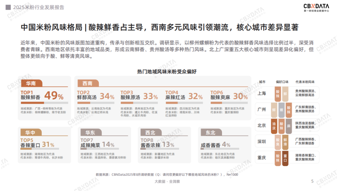 调研数据显示,当下的米粉江湖,以柳州螺蛳粉为代表的“酸辣鲜香”风味一骑绝尘,成为当前市场的绝对主流。从地域溯源来看,西南地区引领着米粉风味潮流——贵州酸汤的浓烈、云南过桥米线的醇厚、重庆酸辣粉的“上头”,各具特色的米粉品类推动地域风味不断破圈。这种口味偏好在核心城市也呈现出鲜明分野:魔都上海偏爱酸辣、鲜香,而山城重庆则将“重口味”贯彻到底。总体而言,清爽酸、鲜风味更符合当下年轻群体对多样化、轻负担的追求。