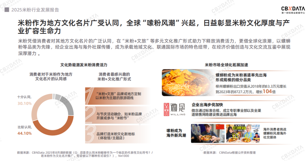 从更广阔的视角看,米粉早已超越食物本身,成为一种被广泛认同的地方文化符号。这份深厚的情感底蕴,将为产业发展带来源源不断的文化活力。超七成消费者认同米粉的文化名片价值,他们对于“米粉+ 文旅” 路线、节庆融合、文化新地标等推广形式有更高的期待。这股文化热潮也加速走向海外,柳州螺蛳粉出口货值自2018年以来增长超百倍,全球“嗦粉风潮”兴起。以微念为代表的企业正在通过标准合规、成立专职事业部以及全渠道销售网络建设加快其出海的步伐。