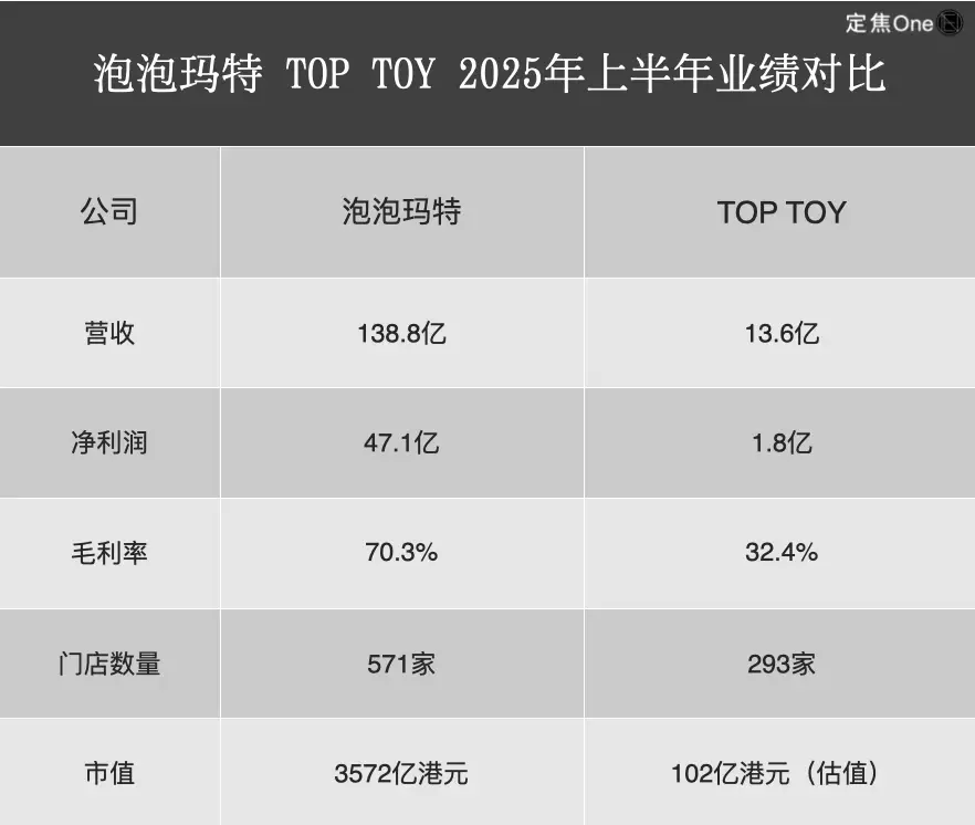 对比之下,泡泡玛特市值一度突破4000亿港元大关。截至2025年9月26日港股收盘,其市值3572亿港元,约等于35个TOP TOY、6.5个名创优品(市值545亿港元)。