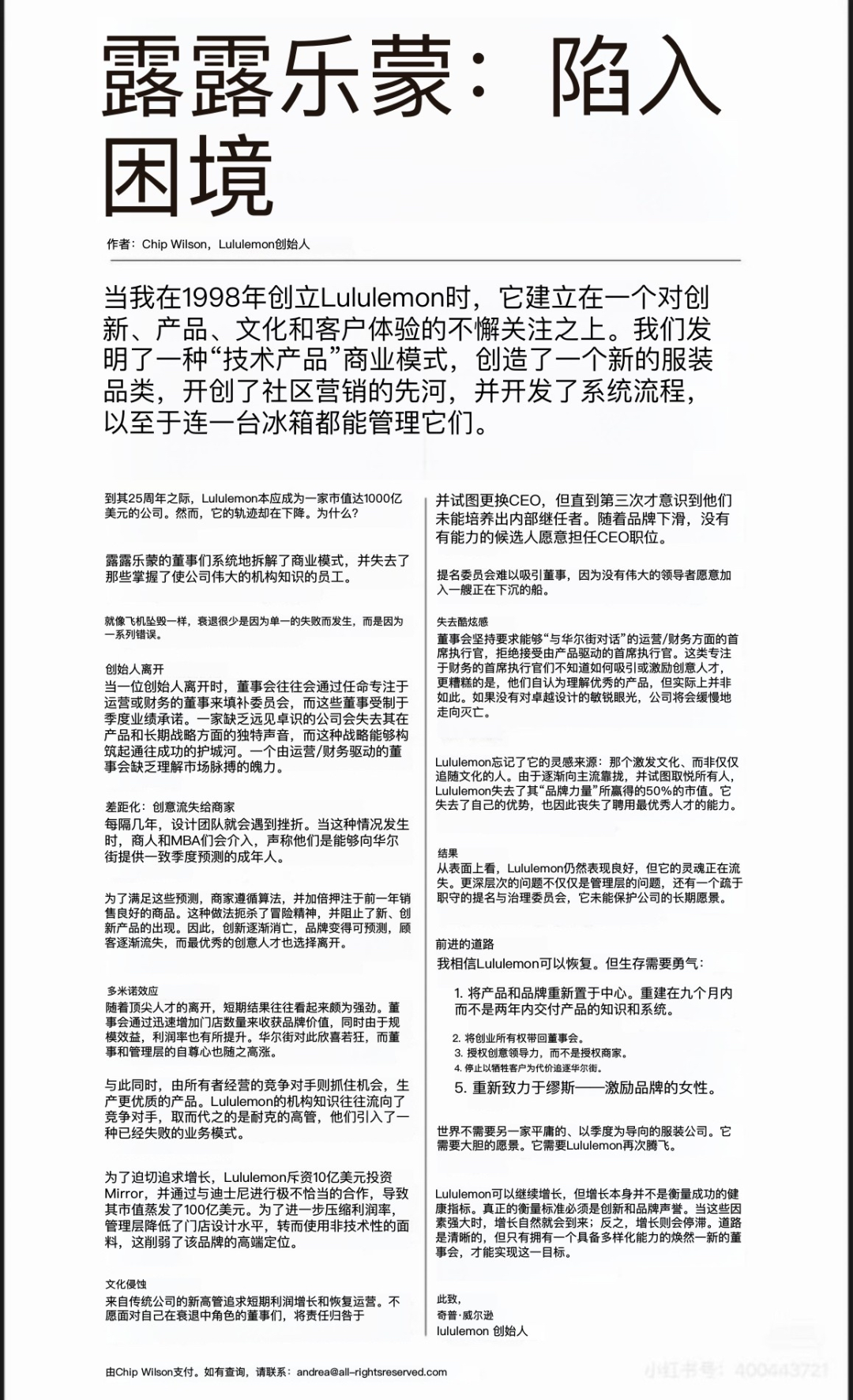 Wilson自费将这封措辞激烈的信件登上华尔街日报,直言lululemon面临设计停滞、生意至上、文化迷失等困境,警告品牌必须要破釜沉舟地进行“灵魂复兴”。