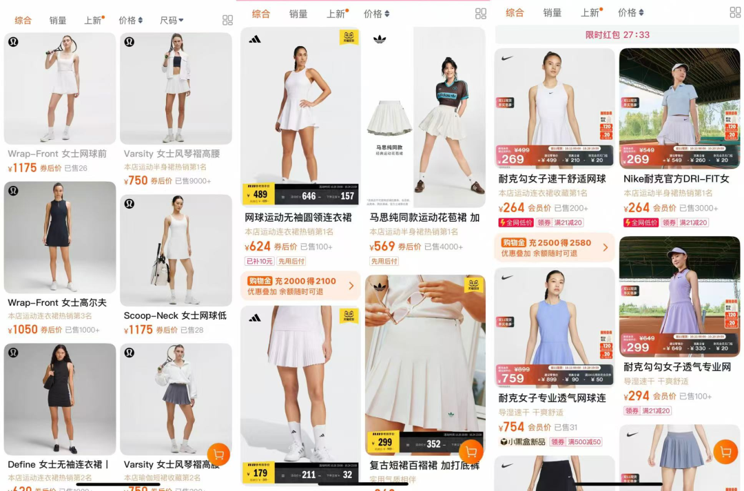 剁椒Spicy观察,作为百亿美金三巨头之一,与Nike、Adidas相比,lululemon的定价普遍高出30%–50%。下图所示,在三者均未构建明显护城河、竞争力相当的网球裙赛道,lululemon热销连衣裙均价1000+,半裙700+;Adidas长裙600+,半裙500+;Nike最热销的一款网球连衣裙原价499,双十一折后仅269元。