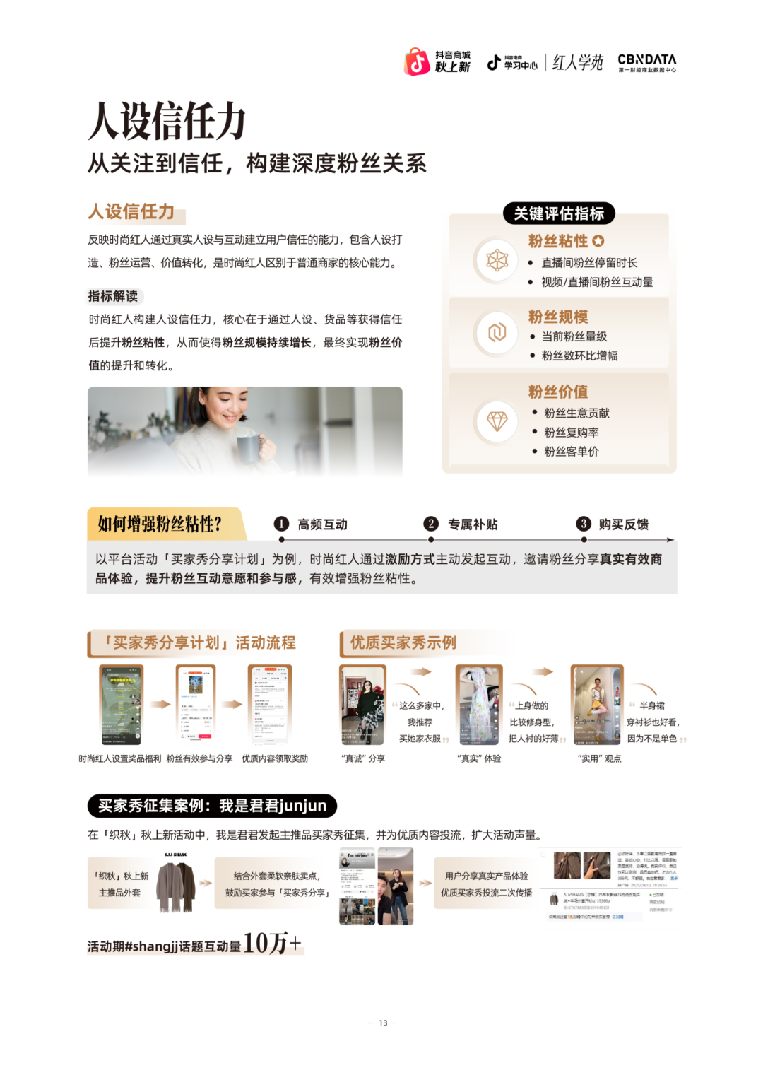 在四力模型中,人设信任力是最关键的突破能力,也是促成深度转化的桥梁。时尚红人通过真实人设与深度互动建立用户信任,实现粉丝粘性、粉丝规模、粉丝价值等关键维度的增长,而做好粉丝粘性是提升人设信任力的关键,商家可通过高频互动、专属补贴和购买反馈等方式提升用户粘性。例如,女装时尚红人@我是君君junjun 通过“买家秀分享计划”激发粉丝参与,形成“真诚分享-真实体验-实用观点”的信任闭环,形成高粘性、高复购的私域资产。