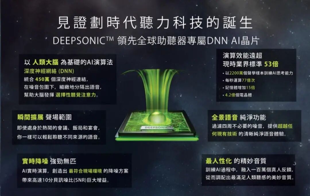 并首次将具有450万个神经信号连接,2200万个真实声音场景样本训练的,业内大规模深度神经网络DNN“超级大脑”嵌入助听器,真正实现了在噪声环境下的万向言语声音处理。