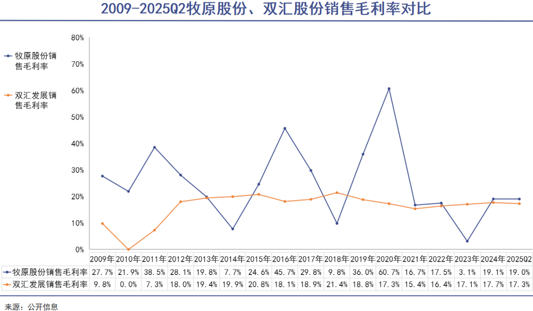 从2009年至今年上半年这十几年间,牧原股份仅有三个年度的毛利率低于双汇发展。尤其是在2020年,牧原毛利率高达60.68%,净利润一度飙升到274亿元,远非双汇发展可比。