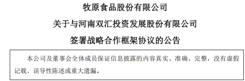 2022年1月1日,牧原股份与双汇发展在河南省漯河市签署了《双汇牧原战略合作框架协议》。根据牧原发布的公告,双方将“以生猪购销为依托,通过完善产业链、提升价值链、打通供应链,提高产品质量、效益和市场竞争力,实现共同高质量发展。”