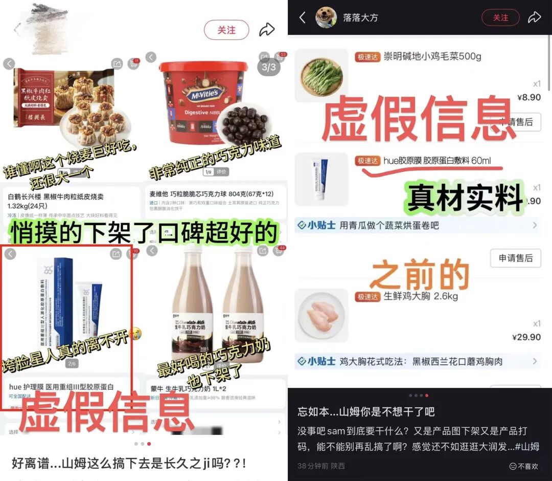 深入观察就能发现,这些在抖音、小红书等平台发布信息的账号,大多带着明显的“带节奏带货”痕迹:有些账号一边质疑山姆的选品水准下滑,另一边顺势推荐所谓的根本未在山姆销售的“被下架好货”;有些账号抨击山姆选品大众化,通过对比山姆商品与自有带货产品,制造“山姆不如平替”的认知误区。