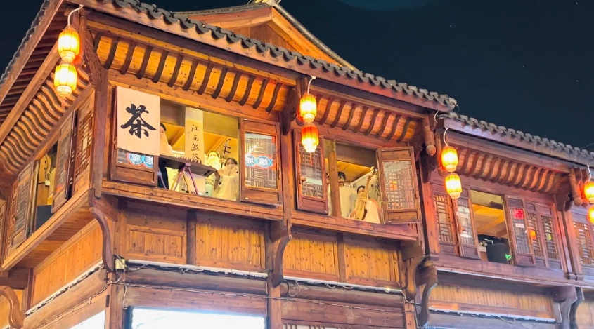 晚上8点,在江西鲲茶万寿宫店里,跟朋友出来旅游的晓玲,刚把自己捧着瓦罐浮梁雪山奶茶的照片发完朋友圈,就专注地欣赏鲲茶门店的汉服夜场演奏。到景区打卡一杯当地特色奶茶,已经是她旅游必备。