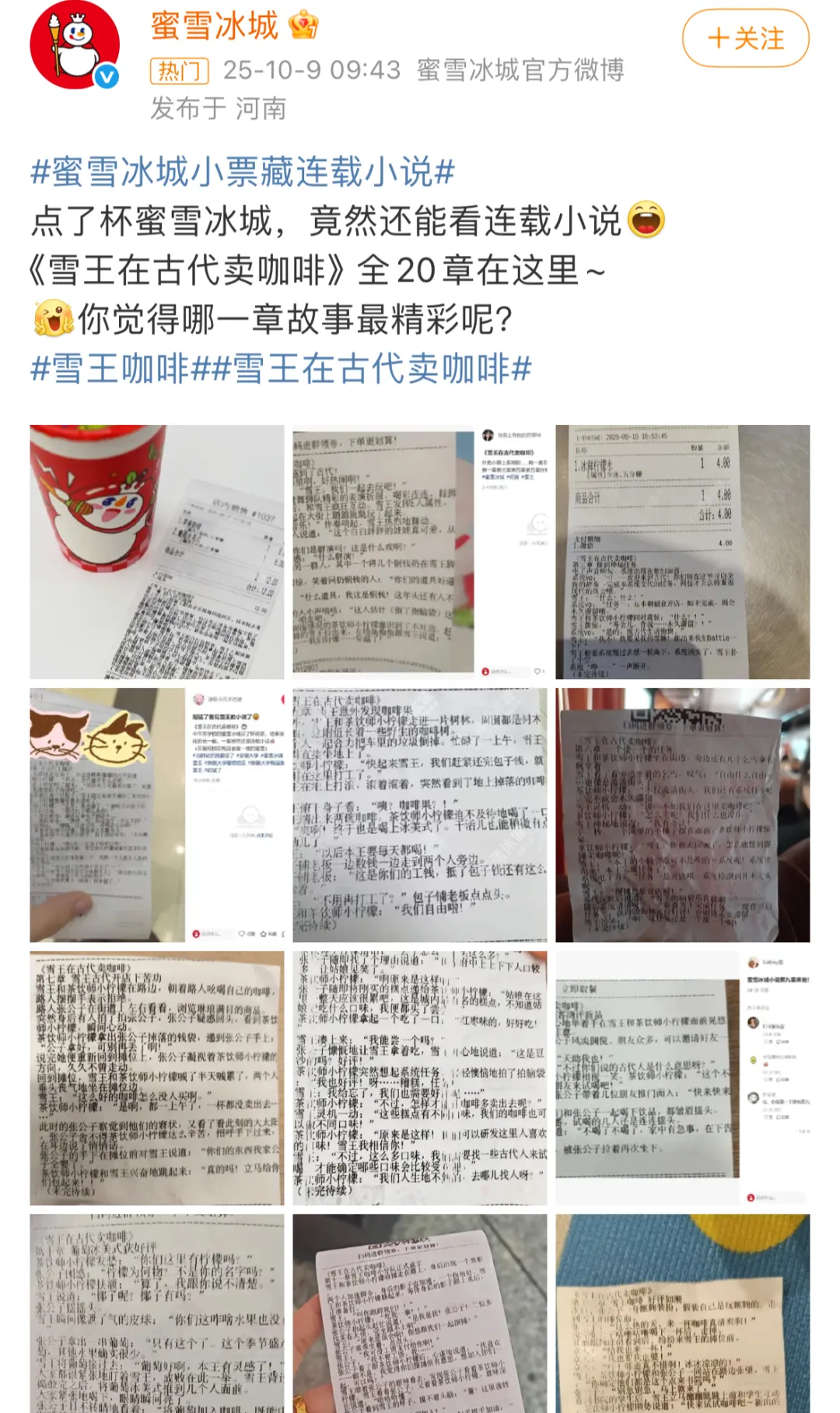 比如此前风靡一时的新茶饮“小票文学”。今年8月底至9月初,茉莉奶白开始在自己饮品小票上连载霸总小说《白月光》,随后,蜜雪冰城也上线了同类的小票文学作品《雪王在古代卖咖啡》,而这都是新茶饮品牌围绕小票玩法不断改进的结果。在此之前,K22酸奶草莓、茶颜悦色、沪上阿姨、CoCo等都有过不同的尝试。