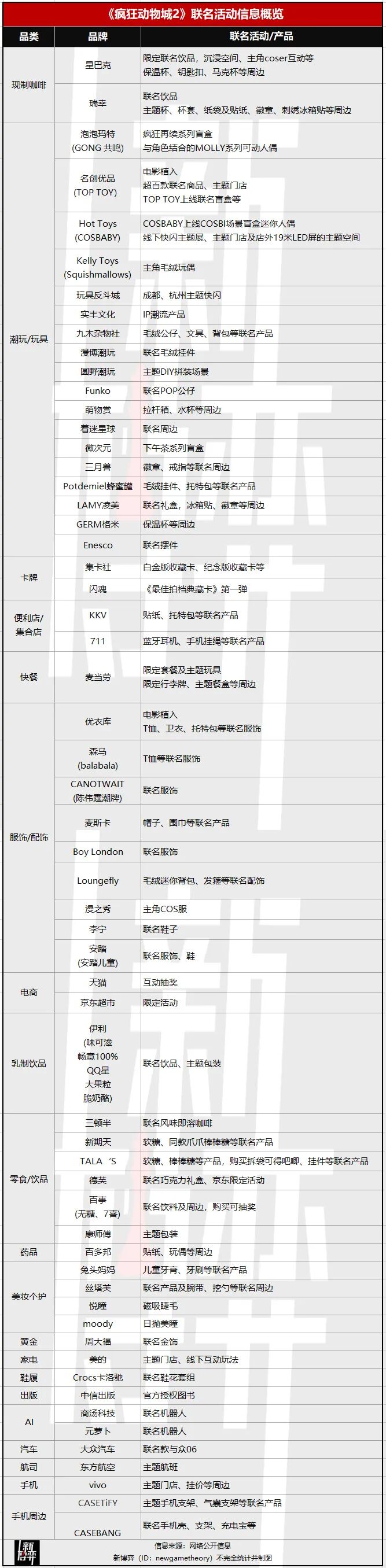 而在《疯狂动物城2》持续爆发的热度之中,除了这一现象级IP自身的影响力之外,各类品牌密集发布的联名活动,也不断为这股热潮添柴加火。据新博弈不完全统计,截至11月20日,《疯狂动物城2》已官宣的联名活动就接近60起,合作品牌覆盖到潮玩、卡牌、服饰、零食、快餐、电商、手机、汽车等多个赛道。