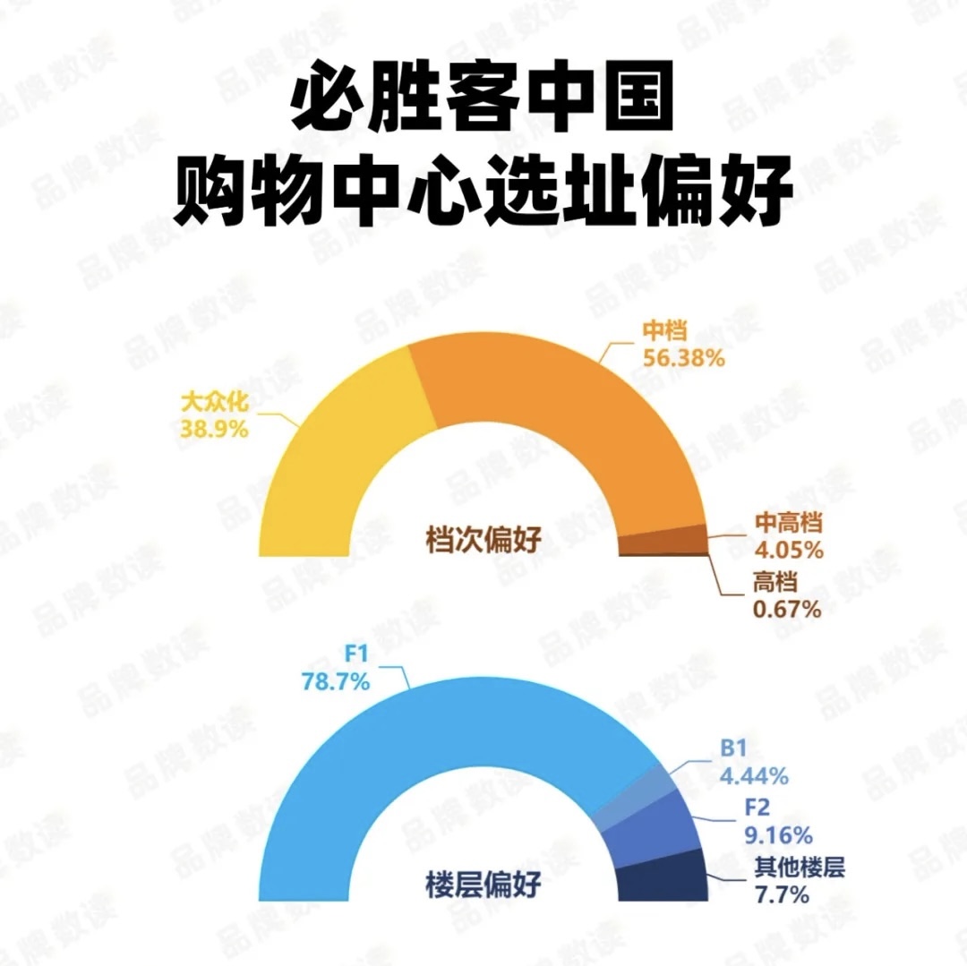 进一步分析其入驻商场的档次可以发现,必胜客极度聚焦于大众化和中档购物中心,二者门店数合计占到商场总店数的超过95%。