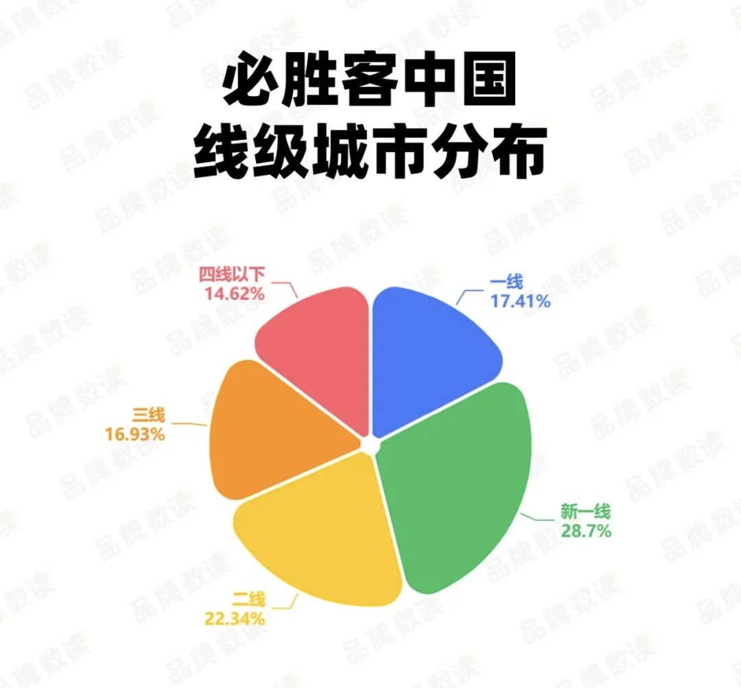 从城市线级分布来看,必胜客目前呈现出典型的“纺锤形”结构。新一线和二线城市的门店数合计占比超过总数的一半,构成了其营收的基本盘;相比之下,三线及以下城市的门店数占比仅为3成左右,下沉市场渗透明显不足。