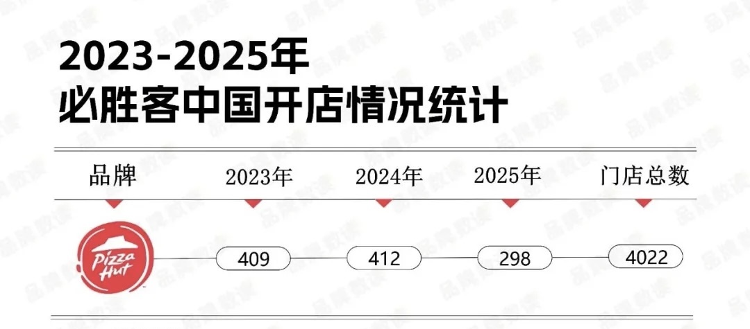 据品牌数读梳理发现,必胜客从2020年净增74家的低点,到2021年增长至235家,2023及2024年均保持着净新增400余家店。