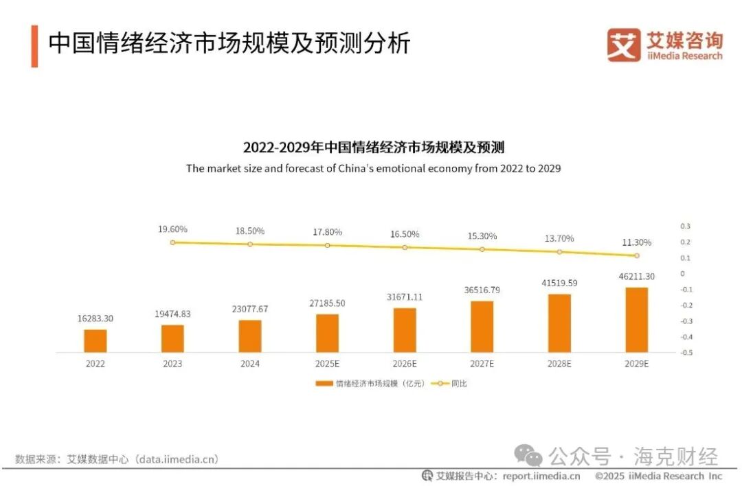 据调研机构艾媒咨询数据,国内情绪经济市场规模持续增长,2024年为2.31万亿元,2025年将增长至2.72万亿元,2029年可达4.62万亿元,CAGR(年复合增长率)为14.9%;在潮玩、体验、宠物、疗愈等情绪消费领域中,包含NPC互动景区在内的沉浸式体验经济,为消费者偏好第一位。