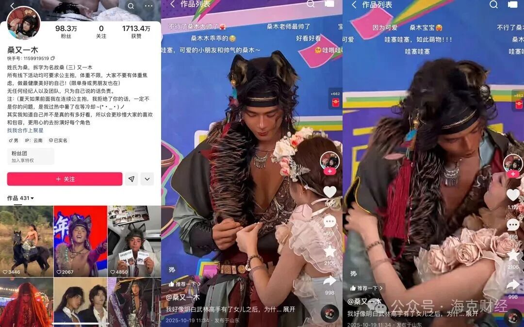 比如凭借黑皮兽耳造型与小奶狗长相迅速出圈的桑木,账号名为“桑又一木”,目前在抖音已拥有176.8万粉丝,在快手已拥有98.3万粉丝。桑木账号还特别标注,线下互动均可进行“公主抱”,体重不限。桑木通过可触碰的真人体验满足用户需求,火了以后,活动也从原先郑州方特欢乐世界的定点演出,拓展至全国多个城市的线下活动。