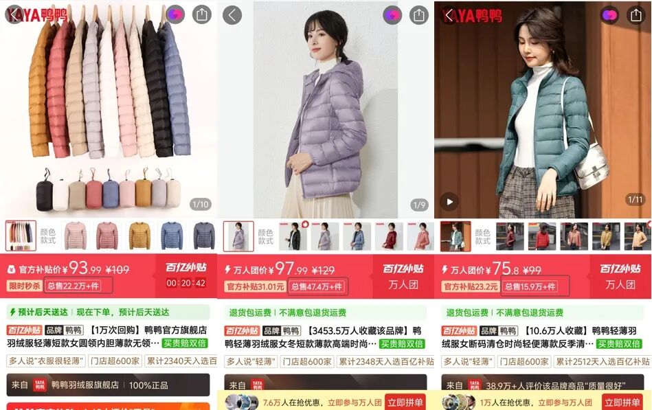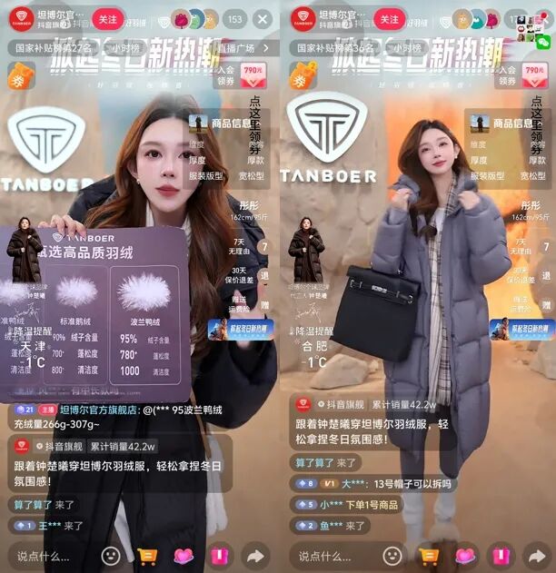 “魔镜洞察”数据显示,今年10-11月抖音羽绒服总销售额同比增长59.5%;双11期间,天猫卖出了超过1000万件冬季羽绒服,波司登、鸭鸭等品牌开售首日成交额破亿,京东运动羽绒服成交额则同比增长4倍。