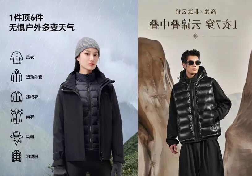 比如伯希和的三合一羽绒服系列以“1件顶6件”为卖点,高梵的黑金5.0系列“云锦鹅绒服”则打出“1衣7穿”的口号,满足春、秋、冬季穿衣需求。尽管高梵黑金5.0系列产品售价并不便宜,达到3000元以上,但“1衣N穿”的卖点,以及适配不同场景、季节的设计理念,却能给消费者带来更多“实用感”。