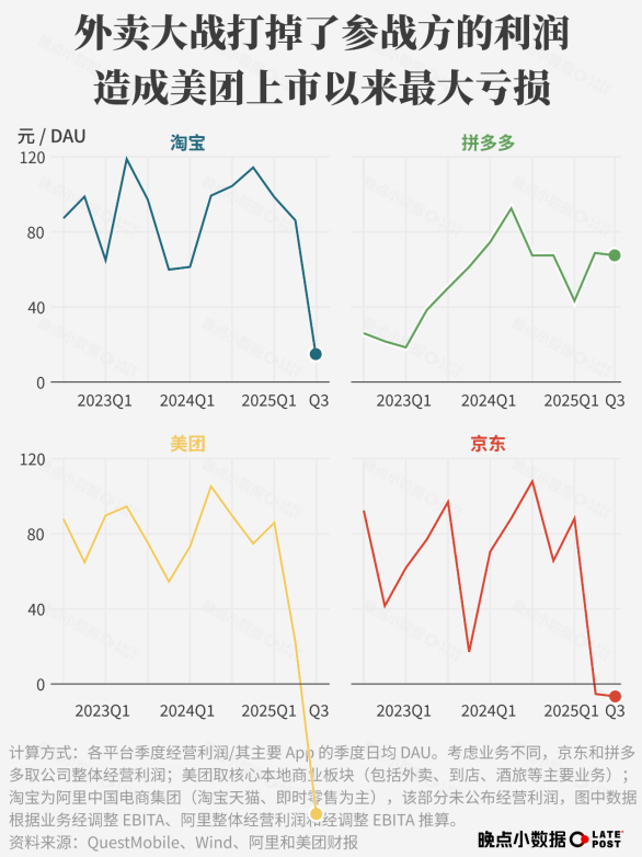11月28日,美团发布的2025年第三季度财报显示,公司实现营收955亿元,同比增长2%,净亏损186亿元,调整后的净亏损为160亿元,同时也是美团自2018年上市以来的单季最大亏损记录。更早之前,京东2025年三季度财报显示,净利润同比下滑55%,以外卖为核心的新业务亏损157亿。