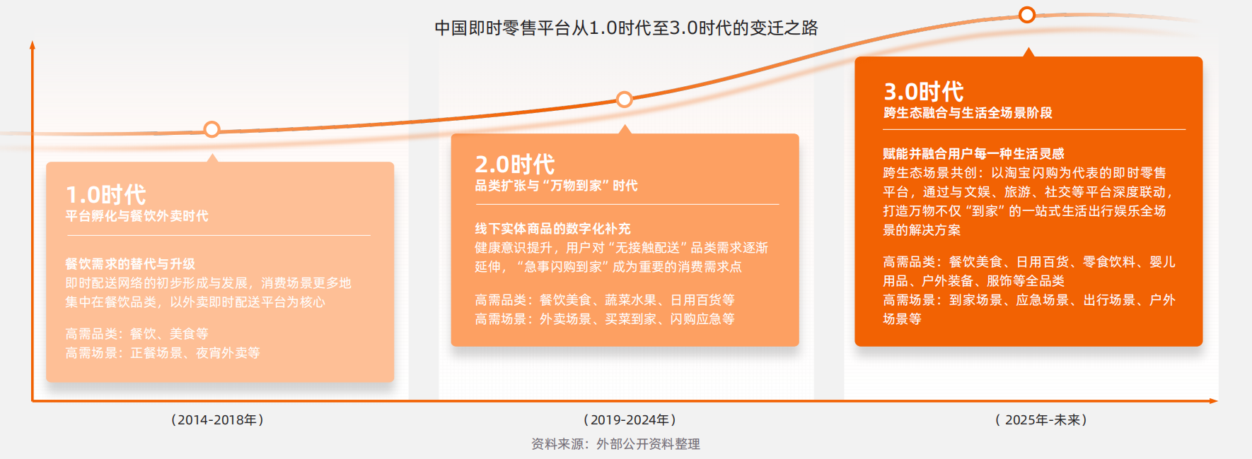 回顾发展历程,从餐饮外卖为主的1.0时代到“万物到家”的2.0时代,再到如今的3.0时代,即时零售通过跨生态融合逐步覆盖全生活场景。以淘宝闪购为代表的即时零售平台,也通过文娱、旅游、社交等平台深度联动,将服务从“万物到家”升级为覆盖生活、出行、娱乐的一站式解决方案。