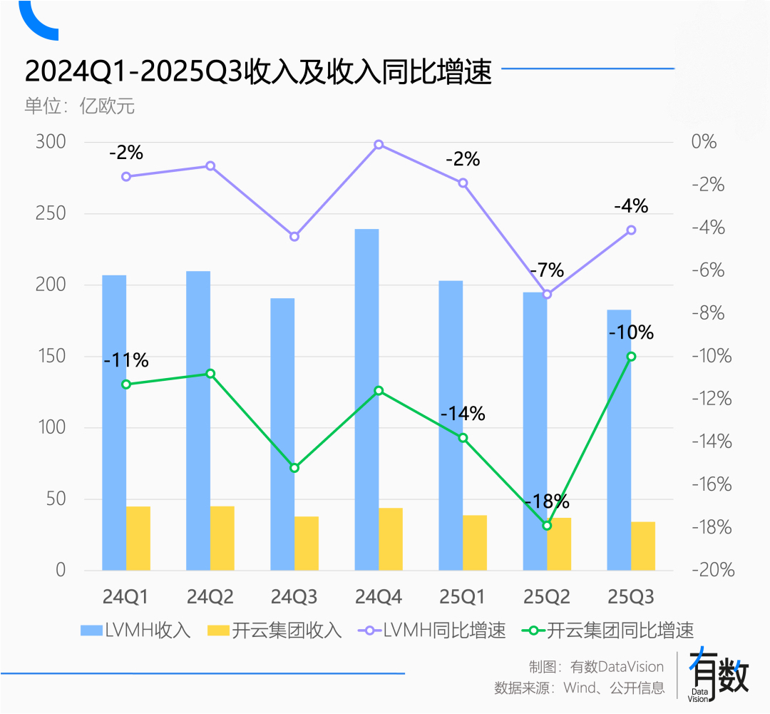 LVMH品牌矩阵相对多元,皮糙肉厚之下勉强能稳住阵脚。经历六个季度下滑后,在2025年Q3终于止跌,营收同比下滑4%,有机增速1%[6]。