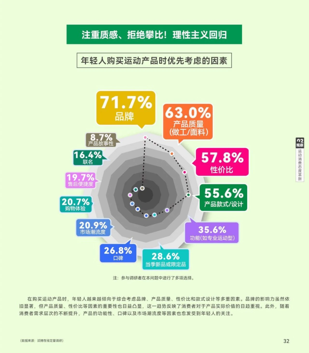 与此同时,对于运动服饰的选择,性价比、质量的重要性正在提升。滔搏发布的《中国泛年轻人群运动消费白皮书》显示,品牌、产品质量以及性价比正在成为年轻人购买运动产品时有限考虑的因素。