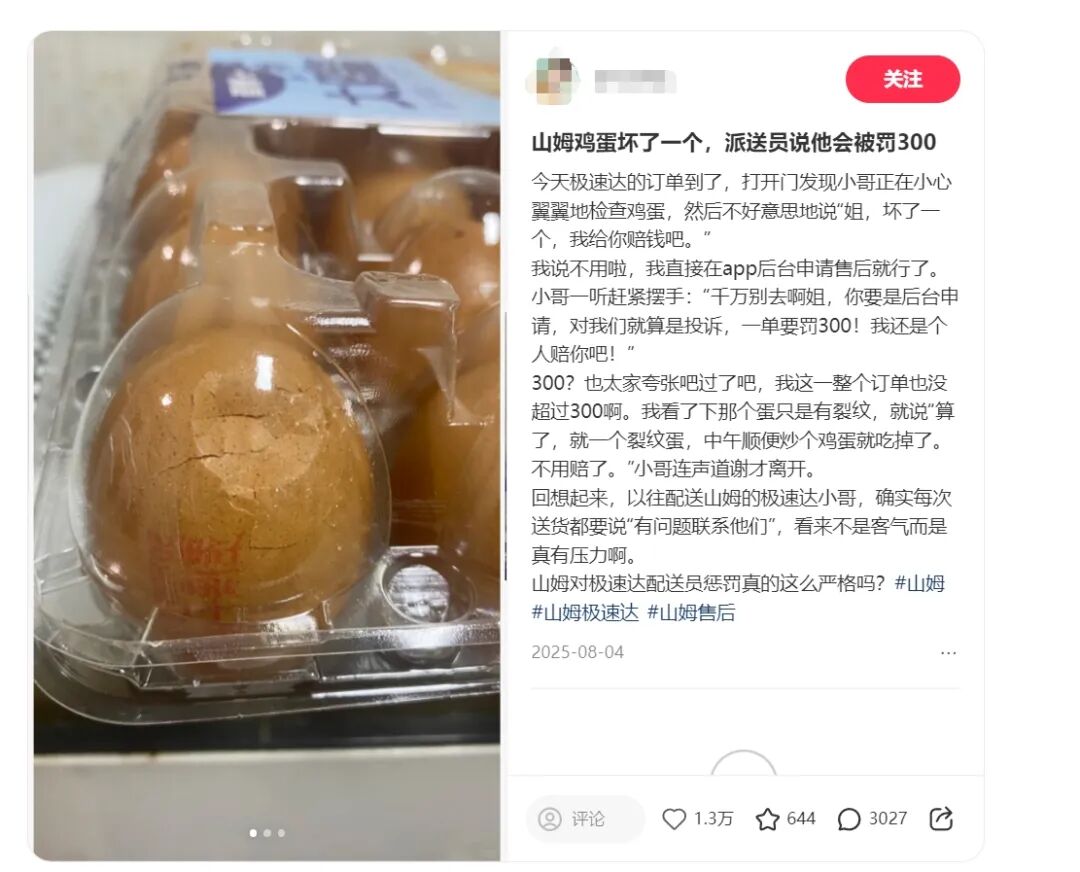 员工这边也传出了与压力有关的消息。2024年开始,山姆配送员“弄碎一个鸡蛋赔300”、“弄碎三个鸡蛋赔1000”等说法流传。山姆的赔偿金已经远远高于极兔快递员的赔偿金额了。有自称是山姆的配送员表示,漏货或缺货需要面临100元赔偿。