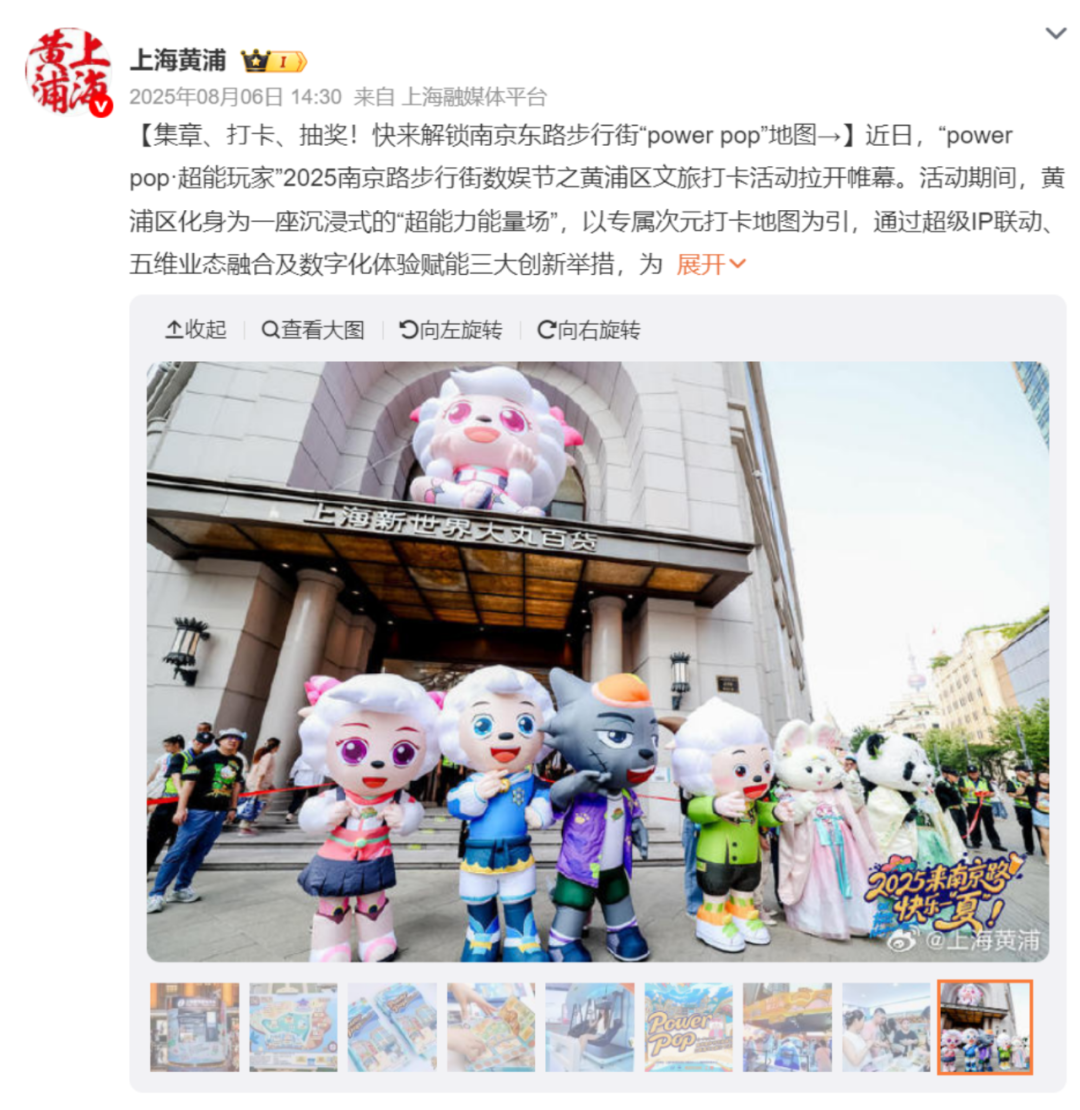 以上海南京路步行街为例,其暑期举办的“G-Power数娱节”,通过引入“喜羊羊与灰太狼”、“卡皮巴拉”等覆盖全年龄段的IP,成功将一条商业街道,转化为一个具有话题性的数字娱乐目的地。16天超160万人次的流量,便是IP为街区带来的、可量化的价值。