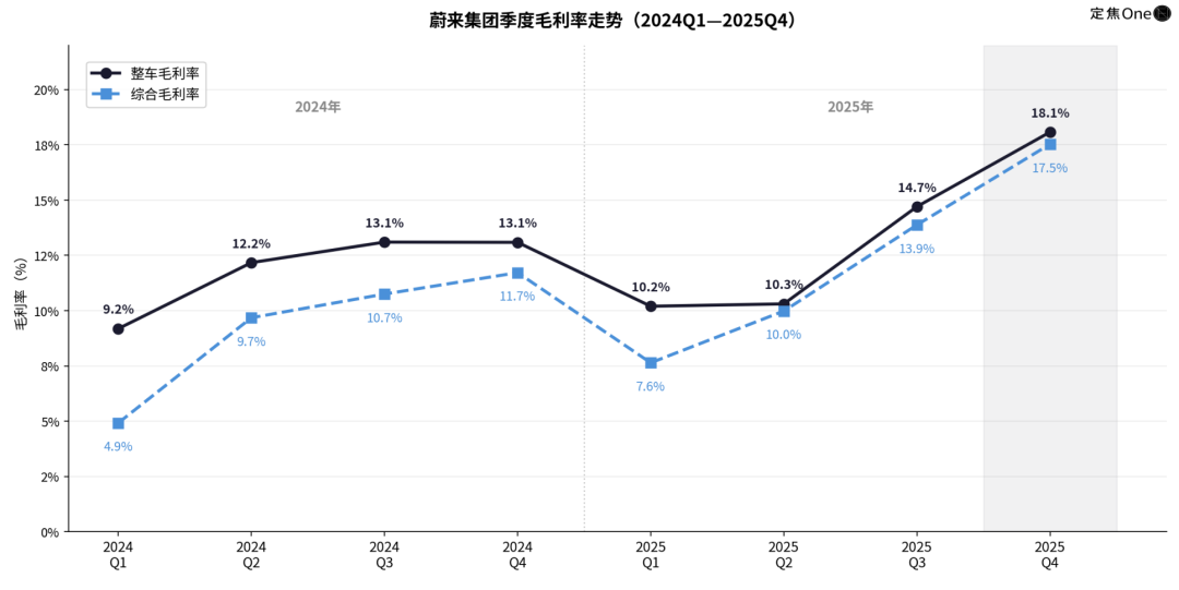 Q4蔚来汽车销售收入316亿元,成本259亿元,毛利57亿元,整车毛利率达到18.1%。这个数字比2024年同期高了5个百分点,比2025年Q3也高出3.4个百分点。