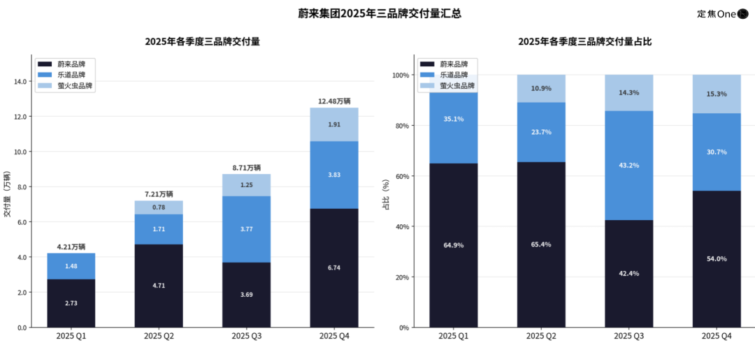 销量规模是基础。2025年Q4,蔚来三个品牌合计交付12.48万辆(蔚来品牌6.74万辆,乐道3.83万辆,萤火虫1.91万辆),同比增加71.7%,环比增加43.3%。这是蔚来单季交付量最高的一次,也是2025年(32.6万辆)占比最重的一个季度,贡献了38%的交付量。