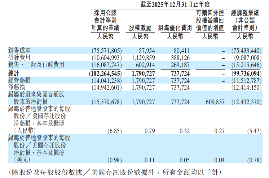 拉长到全年看,蔚来仍是亏损状态:全年收入874.9亿元,同比增长33.1%,综合毛利率为13.6%,比上一年有明显改善;经营层面仍亏损140.4亿元(调整后经营亏损为115.1亿元),全年净亏损149.4亿元(调整后净亏损124.1亿元),但比2024年的224.0亿元明显收窄。