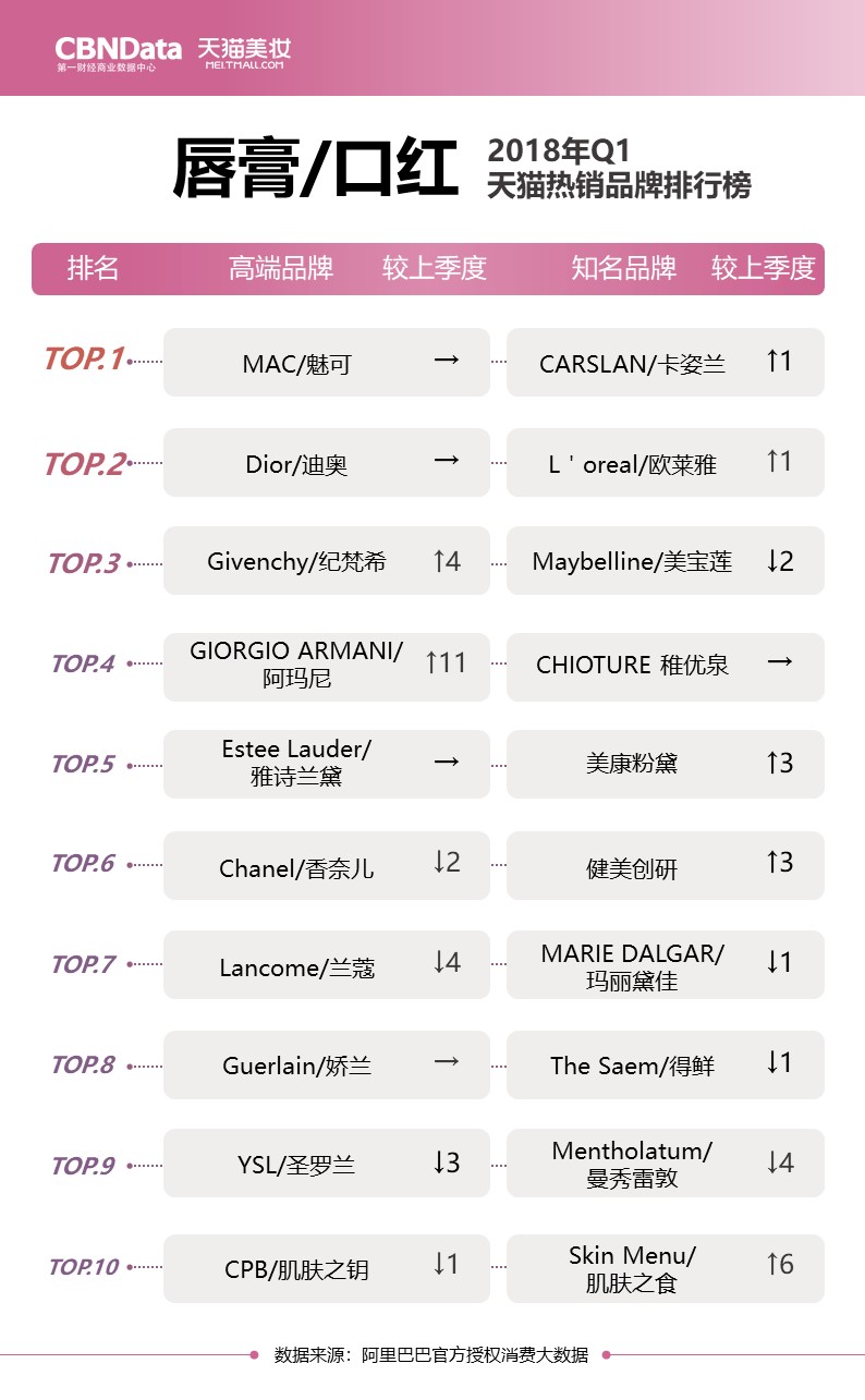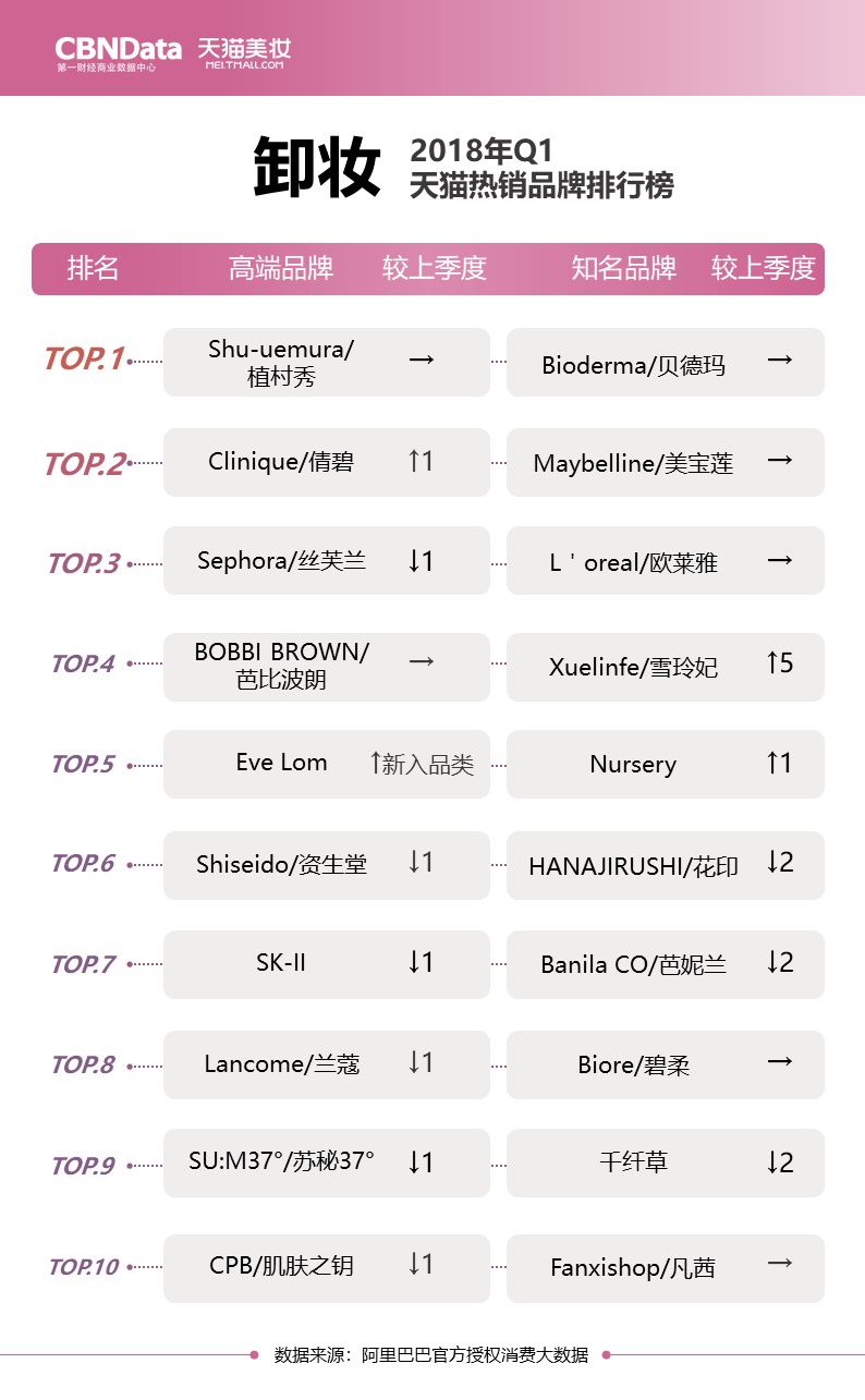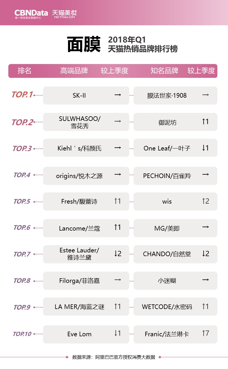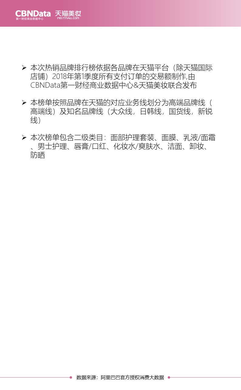 最新榜单出炉!CBNData联合天猫美妆,用大数据为你揭秘2018第一季度美妆热销品牌排行榜。