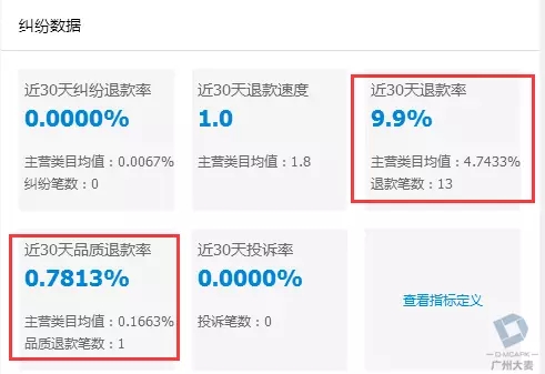 然后就是店铺的退款率,退款速度,品质退款率等等,不说要做得多好,起码不能被同行平均比了下去,淘宝官方没有特定的指标说这些指标做得不好对自然流量影响有多大,不过根据实际案例,退款指标不达标的店铺,发展瓶颈会来得很早,会发现越来越难冲上去。