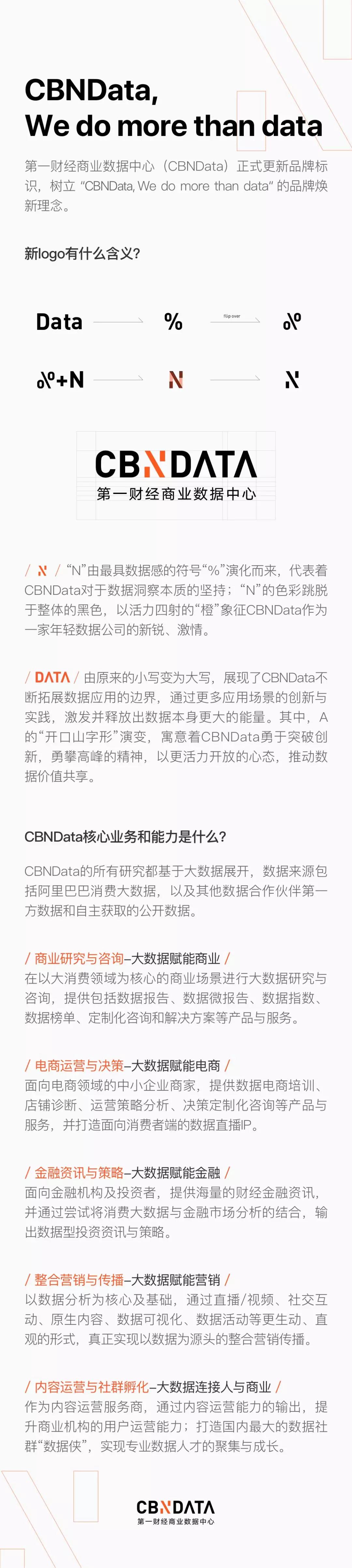 N:由最具数据感的符号“%”演化而来,代表着CBNData对于数据洞察本质的坚持;“N”的色彩跳脱于整体的黑色,以活力四射的“橙”象征CBNData作为一家年轻数据公司的新锐激情。
