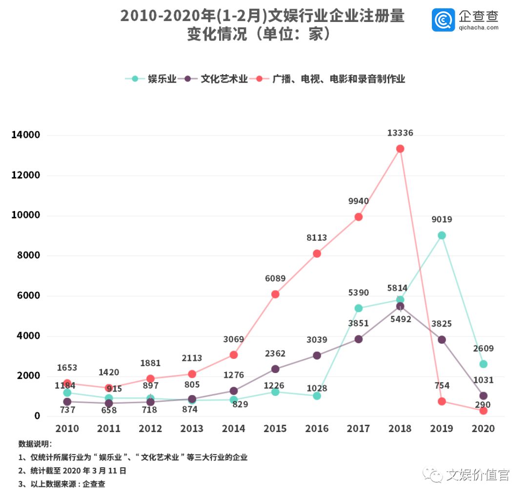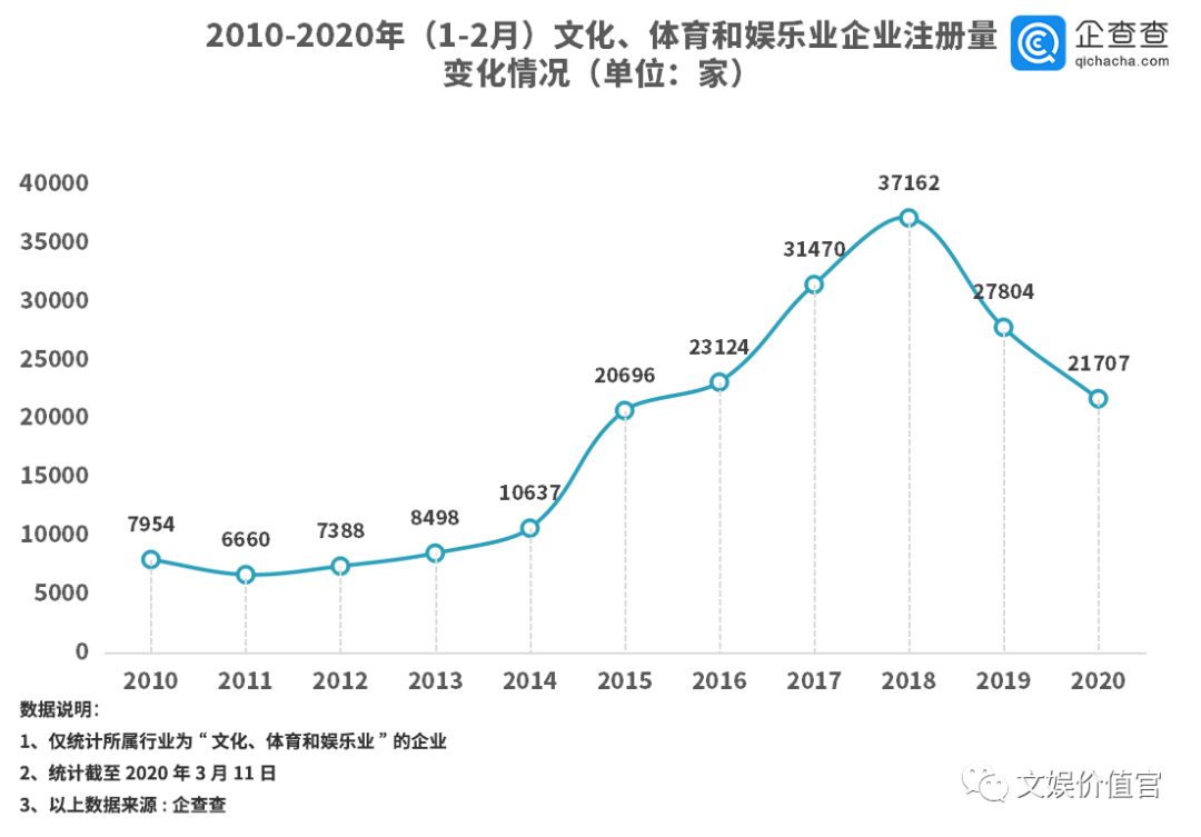 文娱价值官记者发现,受疫情影响,2020年1-2月文化、体育和娱乐行业相关企业的注册量为21707家,比2019年同期注册量减少了21.9%,而2018年同期注册量是2020年的1.7倍。