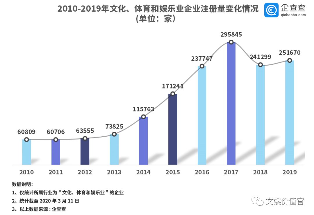 文娱价值官通过企查查数据分析,从注册量变化情况来看,2010年至2017年期间,文化、体育和娱乐行业企业注册量逐年攀升,2017年注册量达到295845家;2018年注册量相较上年减少了18.4%,而2019年文化、体育和娱乐行业企业注册量又有所上升,相较上年增加了4.3%。