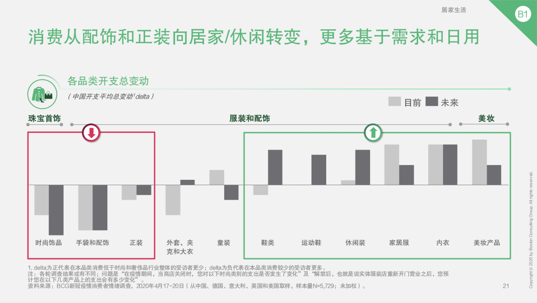 一场与疾病相关的危机让消费者更加关注自己和家人的健康,这也让运动和居家这些休闲品类的服饰迎来了一个增长的机会。报告显示,中国消费者在各品类开支中正从配饰和正装转向更加休闲、适宜居家和运动的品类,解禁之后这一趋势依然延续。