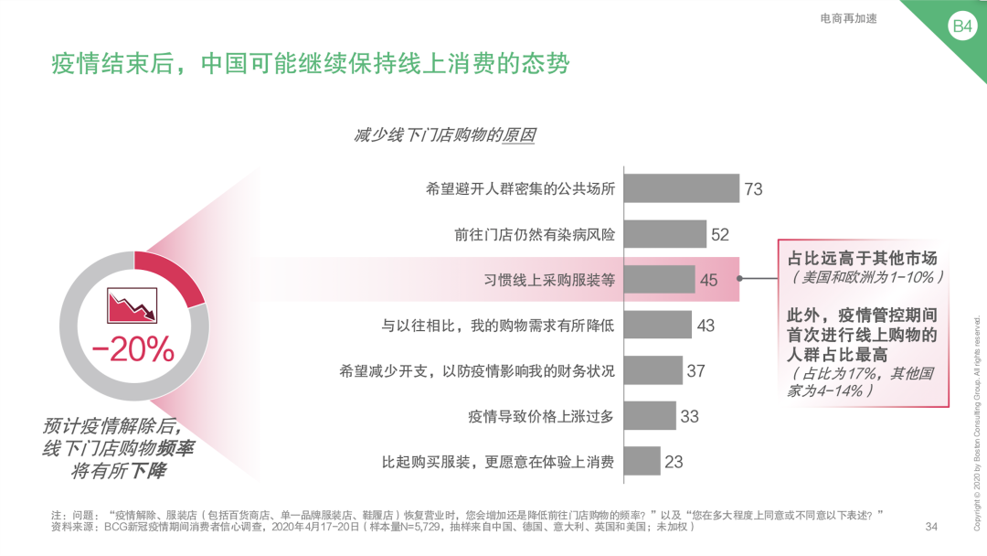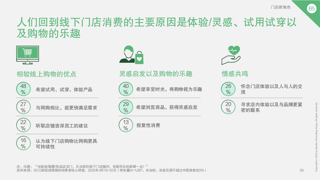 A:目前45%的中国消费者已经习惯网购,在回答 “为何还愿意到线下购物时”,受访者提及了三个主要原因:第一,门店的试穿和产品体验服务;第二,线下店容易感受时尚趋势、获得穿搭灵感;第三,与店员和品牌的互动交流。
