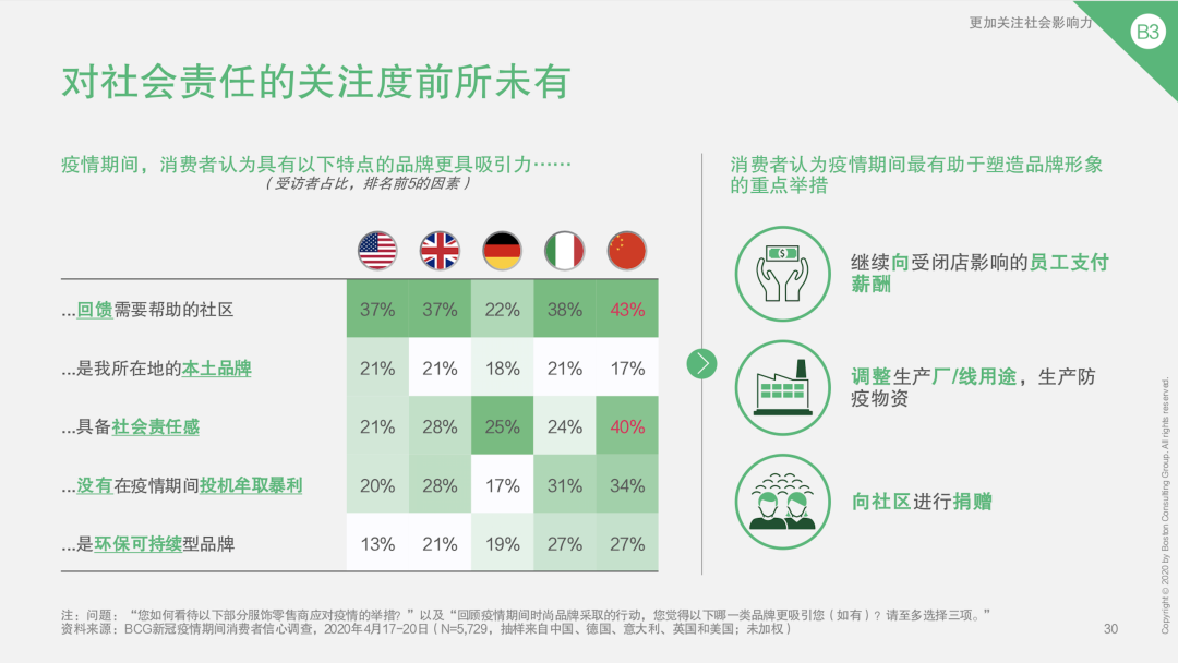 另一个有意思的趋势是,中国消费者在疫情之后对品牌在社会责任和可持续性方面贡献程度的关注达到空前未有的高度,且此关注度首次超过西方国家的消费者。而在疫情期间有在社会责任和可持续性方面作出表率的品牌将更易得到消费者的认可。