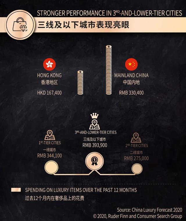 《2020中国奢华品报告》中也提到, 在过去12个月内,中国各级城市在奢侈品上的花费,三线及以下城市约39.39万元,高于一线城市的34.41万元与二线城市的27.5万元。低线城市具有强大的购买力,也是未来中国奢侈品市场发展的机遇与增长引擎。