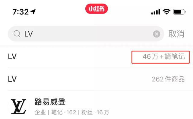 比如在小红书中搜索“LV”,可以看到相关笔记数量高达46万+篇,这其中多半为女性用户“好物”、购买、穿搭的种草分享。