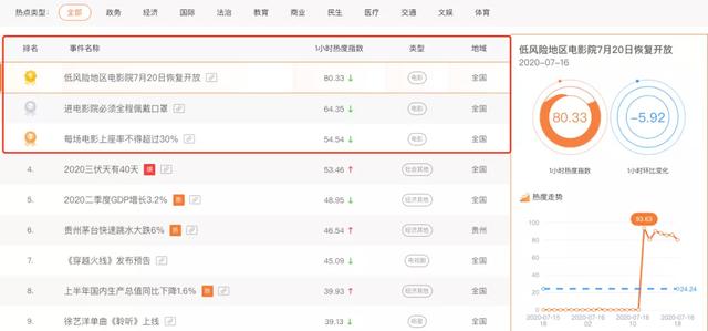 但在这段时间,想念影院的声音从未间断过。所以当国家电影局发出“低风险地区影院7月20日起开放营业”公告时,关于影院的话题立刻成为全网热点,相关内容也长时间占据微博热度前三名。