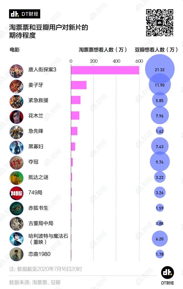 在影迷平台和更大众的购票平台上,《唐探3》仍然有着一骑绝尘的表现,淘票票想看人数超过600万人,是第二名《姜子牙》的4倍多,《749局》的100倍。在豆瓣,期待着《唐探3》的用户也达到21万多人,位列榜首。可见这部电影是当之无愧的大热门NO.1。