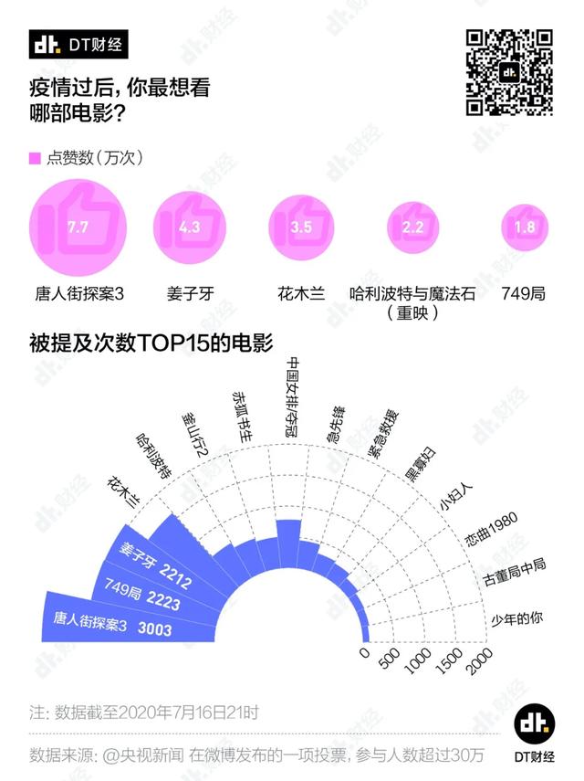 在央视新闻发布影院复工消息的微博下,有超过30万人按捺不住激动的心情,疯狂点赞。这条微博下方的热评,也成了大众对热门电影的期待度排行榜。
